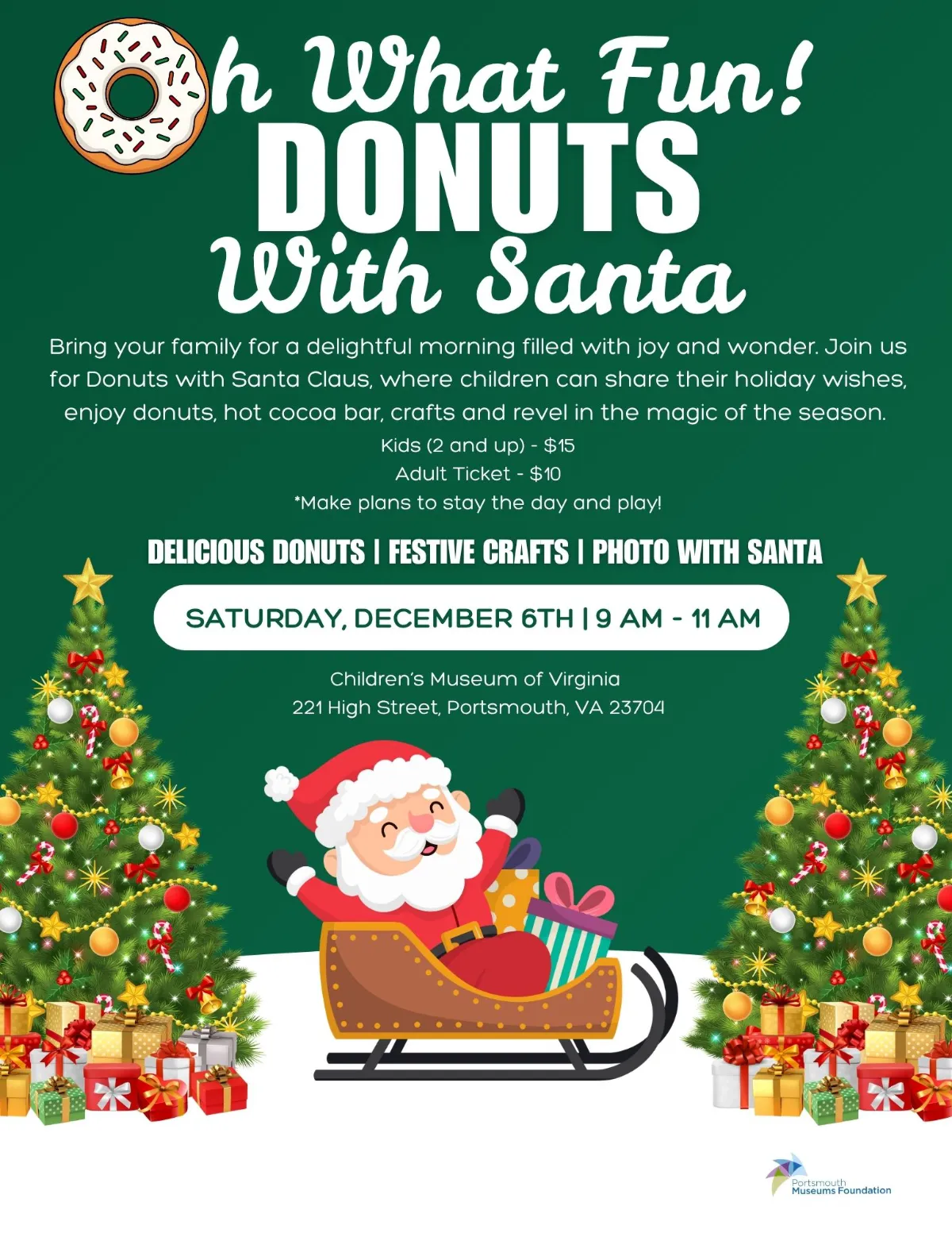 Bring your family for a delightful morning filled with joy and wonder. Join us for Donuts with Santa Claus, where children can share their holiday wishes, enjoy donuts, hot cocoa bar, crafts and revel in the magic of the season.